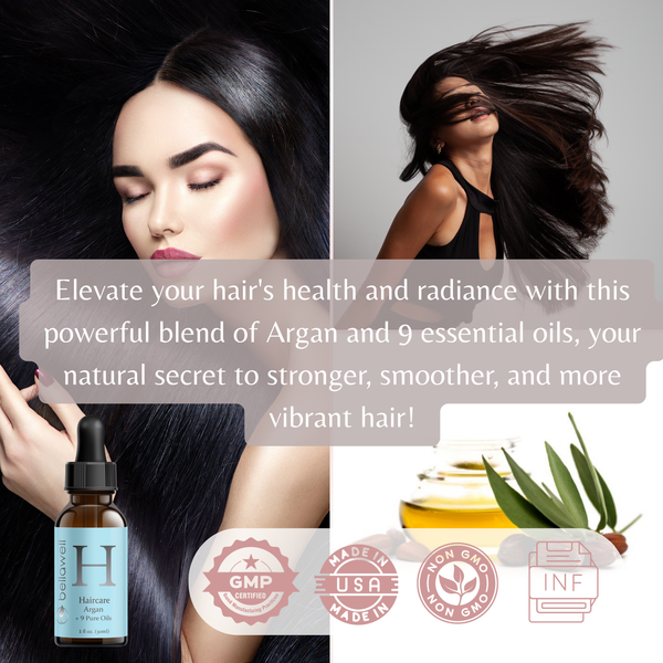 Transform your hair with Bellawell’s luxurious blend of Argan oil and 9 essential oils, carefully selected to strengthen, hydrate, and protect. Argan, Jojoba, and Apricot Kernel oils work together to reduce split ends, restore softness, and deeply moisturize the scalp.